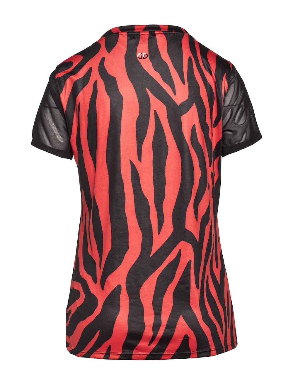 De Goldbergh Tigina Shortsleeve Top 2022 is een prachtige damestop met korte mouwen. Het shirt is ademend, lichtgewicht, sneldrogend en anti-geur. Geschikt om in te sporten, maar kan ook casual gedragen worden! De mouwen zijn gemaakt van transparant mesh. Op de voorkant bevindt zich het glimmende Goldbergh logo. De opvallende tijgerprint en rode kleur zorgen ervoor dat je stylish je workout kunt doen! Luxury meets sports!