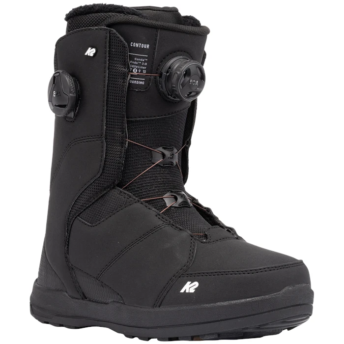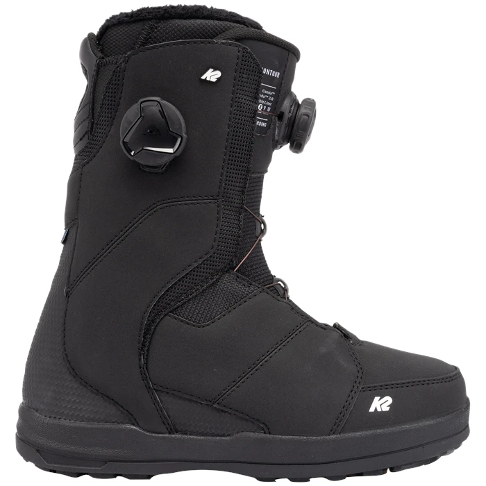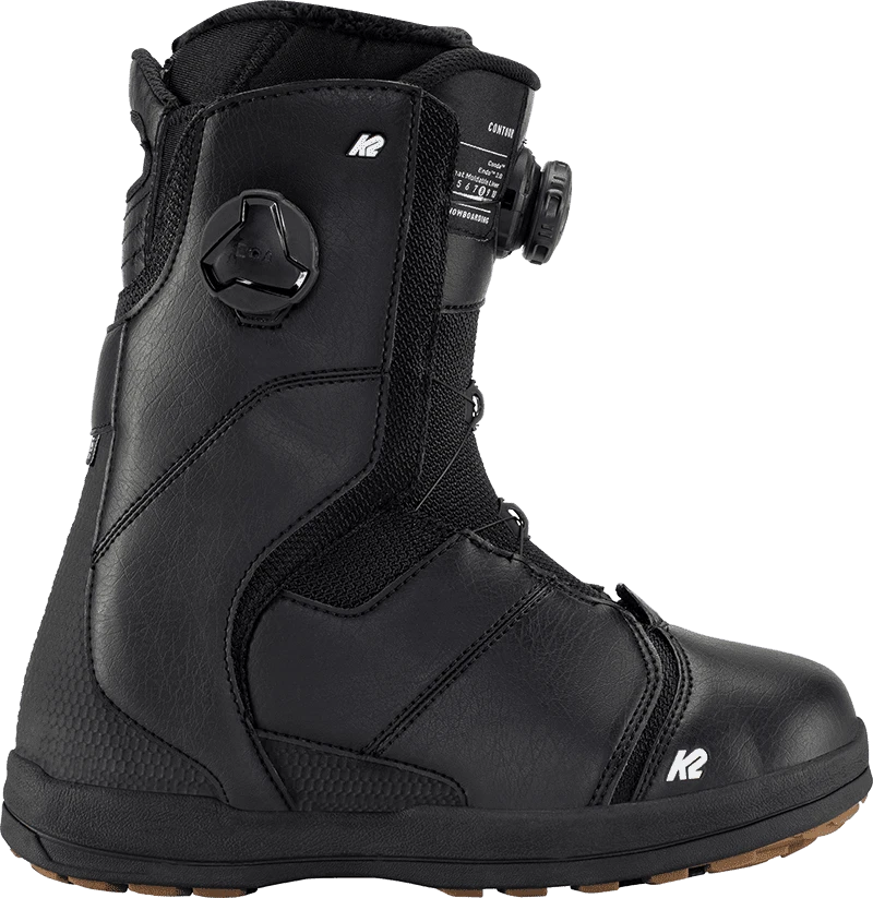 De K2 Contour is een boot met een dubbele Boa sluiting. Zowel de binnenschoen als de buitenschoen worden vastgezet door deze eenvoudige sluiting. De binneschoen is zeer comfortabel en lekker warm, laat zich aanpassen door warmte en is smal bij de hiel voor een goede fixatie. De speciale demping in de zool geeft je meer rust in de voeten waardoor je langer door kunt boarden zonder gezeur en vermoeide voeten. Met zijn tijdloze zwarte look is deze boot jou maatje voor veel jaren boardplezier. De schoen is ten opzichte van vorig jaar nauwelijks veranderd.