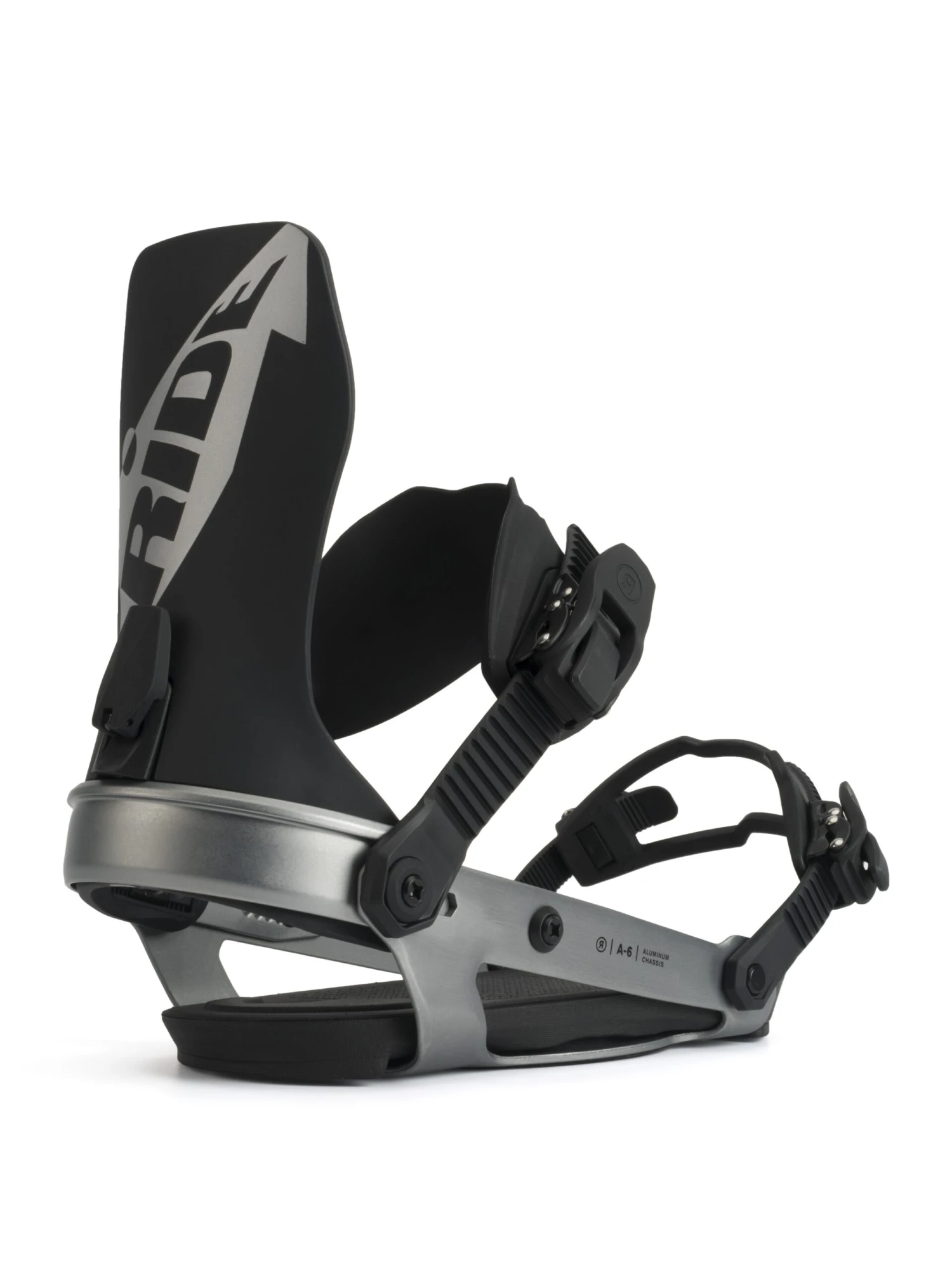 De Ride A6 is bezig aan zijn tweede seizoen. Het is de vervanger van de welbekende Ride Rodeo. Het enige wat nog herkenbaar is, is het gebruik van het aluminium chassis. Dit chassis is goed verstelbaar naar de maat van je schoen en wordt afgedekt met een voetbed dat 2,5 graden gekant is, zodat je minder spanning op je benen krijgt. Ook is er gedacht aan demping voor meer comfort. De straps, voor zowel de teen als de enkel, zijn minimalistisch opgebouwd en geven een goede fixatie zonder drukpunten. Dus geen voeringen en zachte stofjes?! Nee, gewoon een perfecte strap die goed vormt om de shape van je boot en die geen knelpunten geeft. De high back is gemaakt van een speciaal kunststof. Dit geeft de binding naar achteren de stijfheid die hij nodig heeft voor een goede sturing. Maar zijwaarts is er de mogelijkheid om wat meer zijn freestyle eigenschappen te ontdekken. Daar zit wat meer bewegingsvrijheid voor de tricks. De forward-lean is goed in te stellen en werkt eenvoudig. Met de nieuwe kleuren, is dit weer een fijne binding.