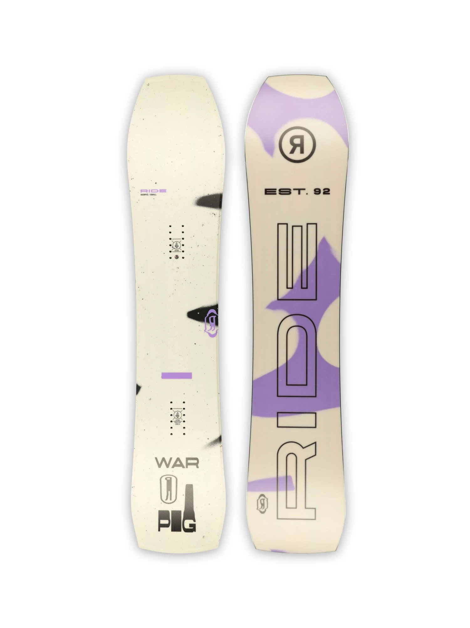 De Ride WarPig is een aparte verschijning vanwege zijn vorm en looks. Dit board heeft een directional “platte” vorm met een rocker in de neus en in de tail. Dit zorgt voor heel veel wendbaarheid die je op elke plek op de berg kan toepassen. Door de bredere waist is het board heel goed drijvend en zal in de verse sneeuw net zo goed uit de verf komen als een board dat 20 cm langer is. De kern is opgebouwd uit 2 soorten hout en bamboe. Er liggen meerdere lagen glasvezel overheen voor een goede mix tussen stijfheid en response. De sidealls zijn vorig jaar wta aangepast omn een nog betere overdracht van de kracht op je staalkant te geven. Meer grip, betere carves en dus meer board-plezier tot gevolg. De base is hard en snel, dus glijden maar! Deze base is plat en houdt hem rustig op de paden als je deze vlak rijdt. Stop er nog wat speciale ingrediënten in zoals wat carbon onder de voeten met en uitloop naar tail en nose, voor extra response, een tapered shape, je neus is breder dan je tail, voor een wat makkelijkere kantenwissel en beter drijfvermogen, en je hebt een ‘new-school’ all-mountain wapen dat nergens voor terugdeinst.